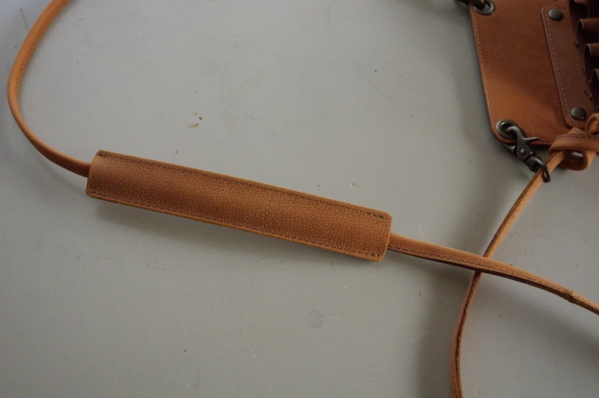 中に芯を入れたりして土台部分の型崩れがしないようにしていたり、肩掛けのストラップは結構長めに作っているので、写真のように縛って頂く形でお使いください(ご希望であれば、カットして縫い合わせて納品することも可能です)